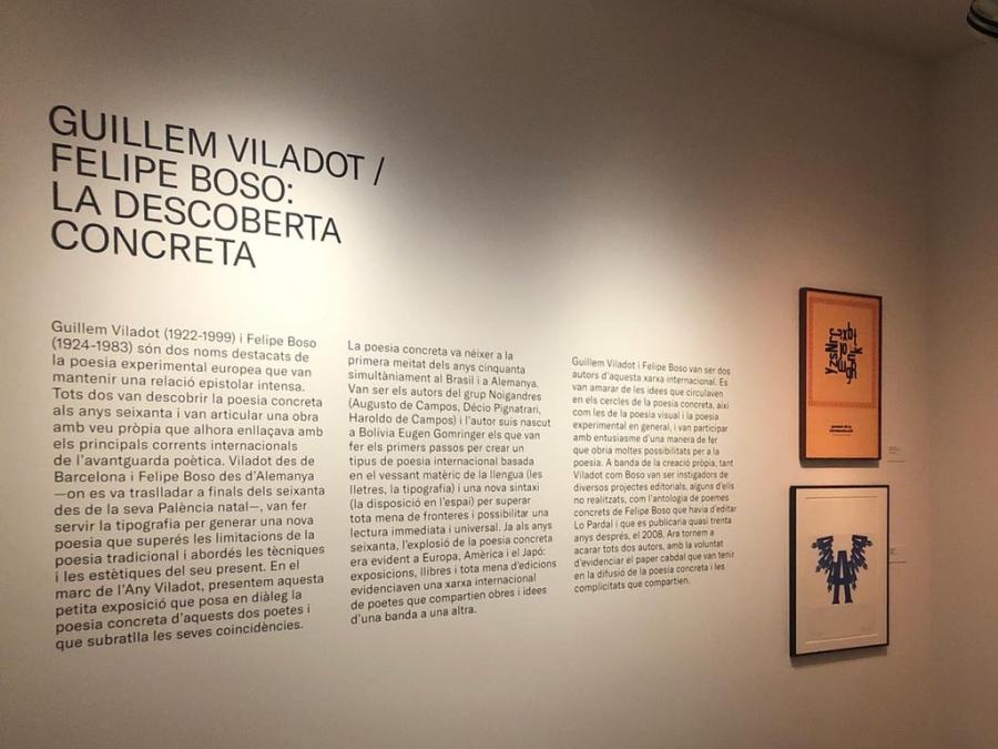 Guillem Viladot (1922-1999) i Felipe Boso (1924-1983) són dos noms destacats de la poesia experimental europea que van mantenir una relació epistolar intensa. Tots dos van descobrir la poesia concreta a finals dels anys seixanta i van articular una obra pròpia que alhora enllaçava amb els principals corrents de l’avantguarda poètica internacionals. Viladot des de Barcelona i Felipe Boso des d’Alemanya —on es va traslladar a finals dels seixanta des de la seva Palència natal—, van fer servir la tipografia per generar una nova poesia que superés les limitacions de la poesia tradicional i abordés les tècniques i les estètiques del seu present. En el marc de l’Any Viladot, presentem aquesta petita exposició que posa en diàleg la poesia concreta d’aquests dos poetes i que subratlla les seves coincidències.